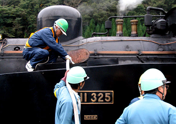係りの人が長いホースでC11に水を飲ませていますが、
