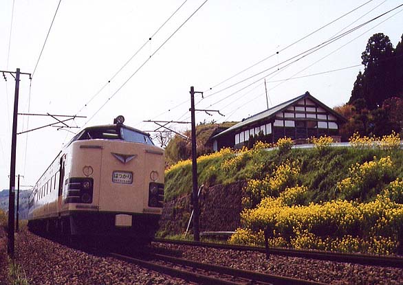 菜の花と古い納屋?が19年ぶりの「はつかり」を見送ります。
