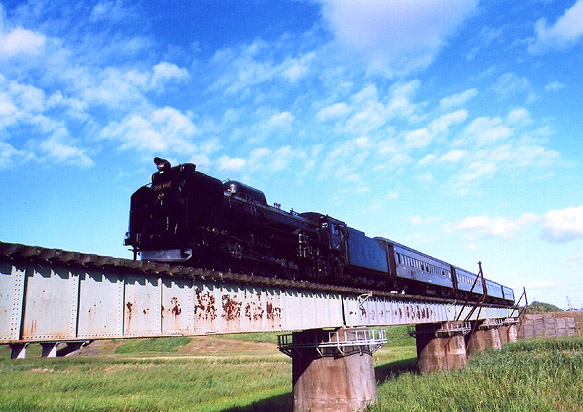 抜けるような青空の下、真っ黒なSLと茶色い旧式客車が駆け抜けます。