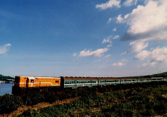 ディーゼル機関車が古ぼけた客車列車を牽いて駆け抜けていきました。